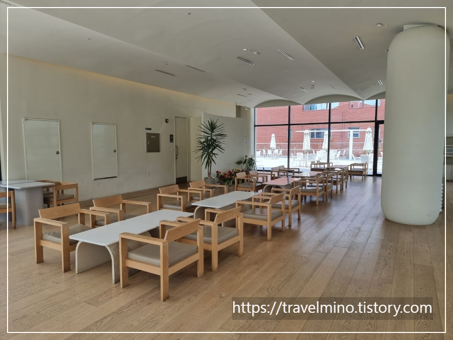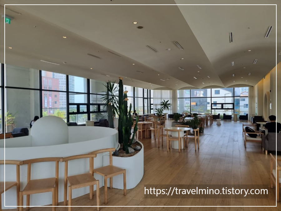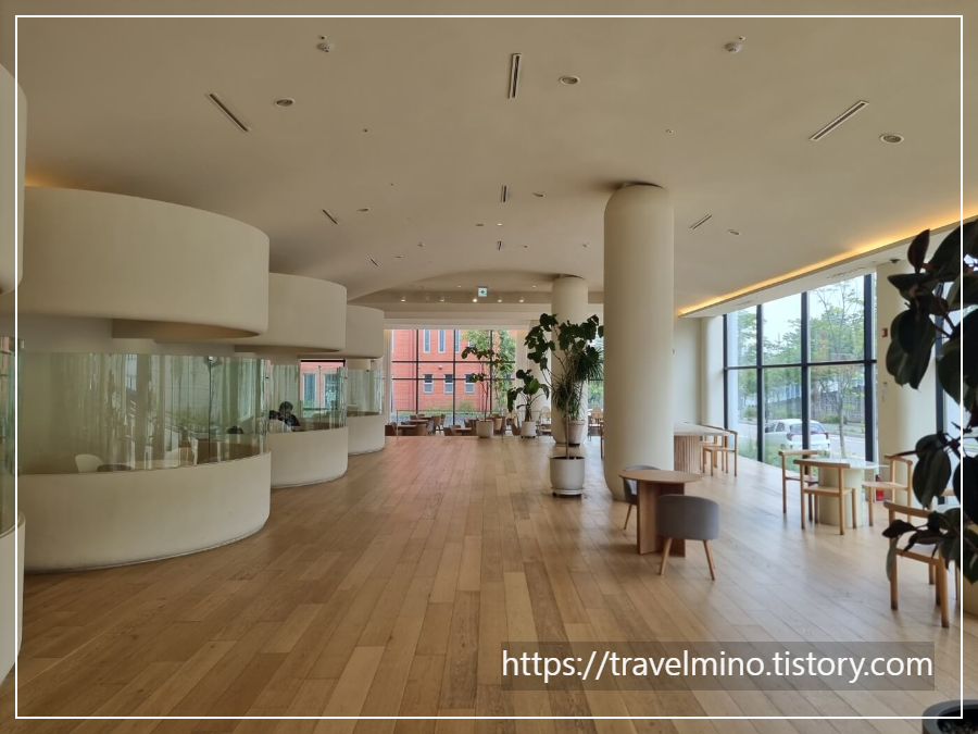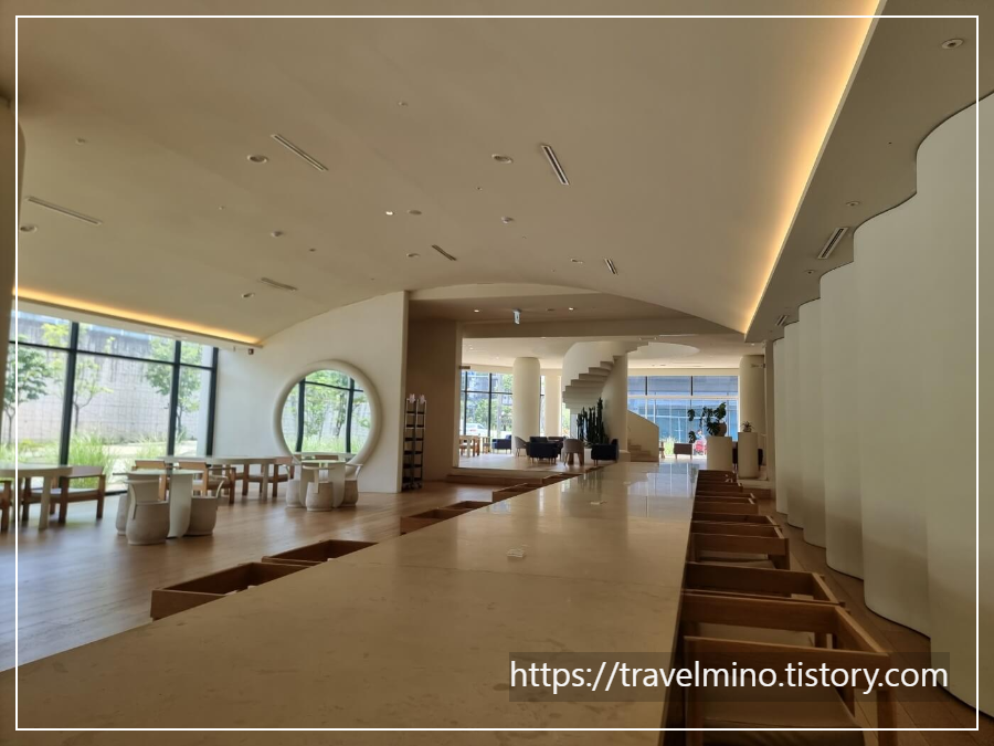 1층 카페 실내에 들어가면 웅장한 실내 공간에 또 놀라게 됩니다. 1층 실내 끝에서 반대쪽 끝을 바라보면 사람이 개미처럼 보이는데 직선거리로는 100m 가까이 되어 보였어요. 천장이 높고 테이블 간격도 여유 있어서 쾌적한 느낌에 반하게 됩니다. 그리고 좌석도 다양한 형태가 있는데 개인 프라이빗이 보장된 유리벽의 룸형 테이블도 있어요. 한쪽 끝에는 동남아 스타일의 테이블도 있군요.