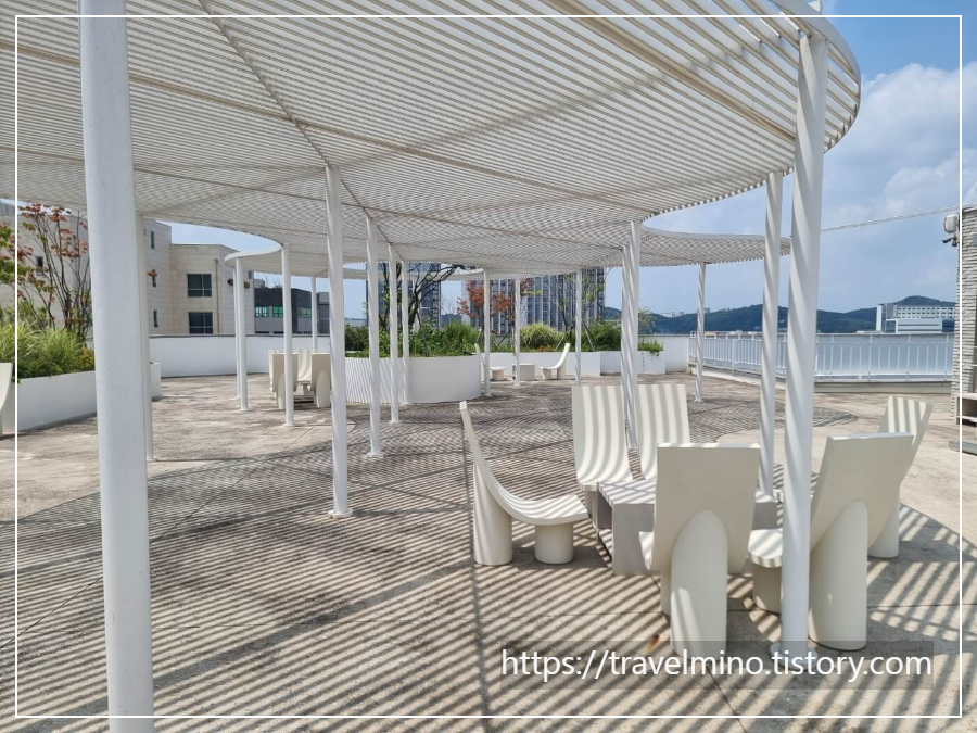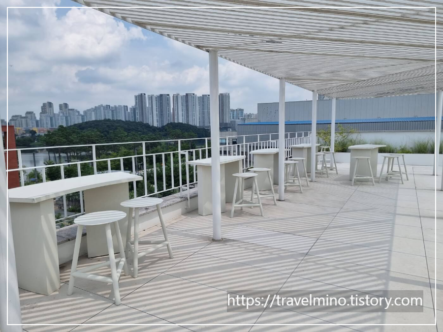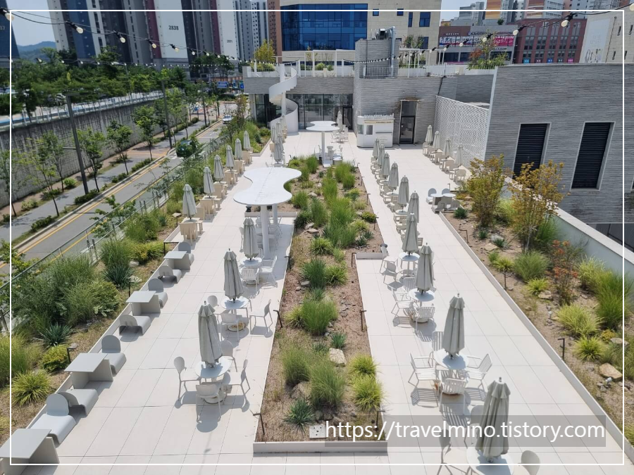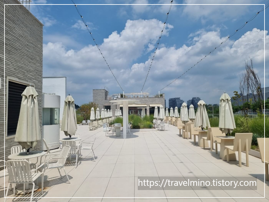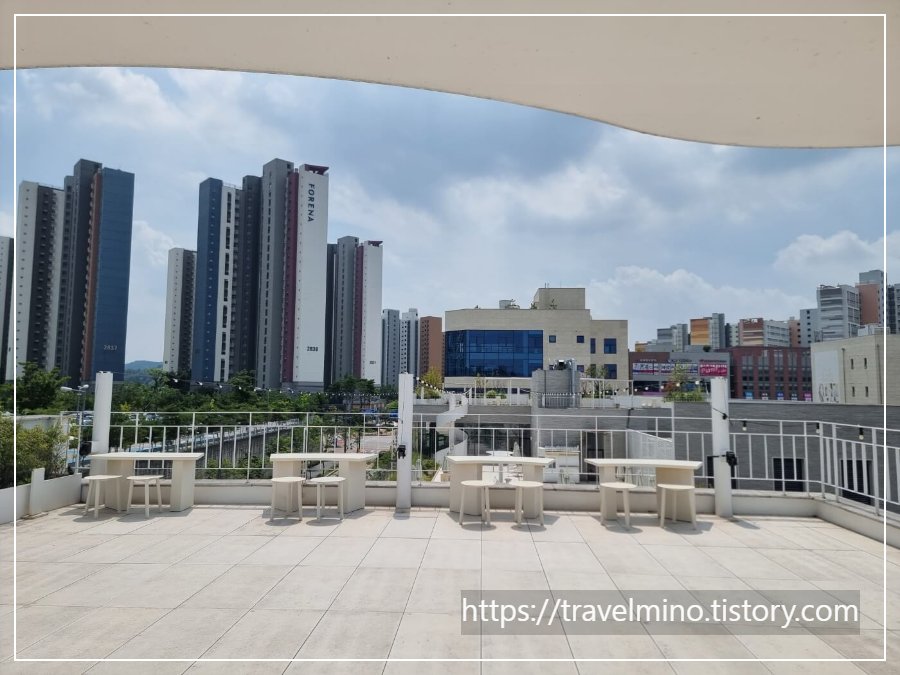 포근 베이커리 카페는 3층 옥상 테라스도 있습니다. 2층 테라스에 이어 테이블이 또 나옵니다. 옥상에 올라가면 동탄 호수공원 주변의 시티뷰가 보이는데 전망은 그리 좋아 보이질 않네요. 근접한 위치는 아니지만 좀 거리감 있는 아파트들이 줄지어 보이네요.