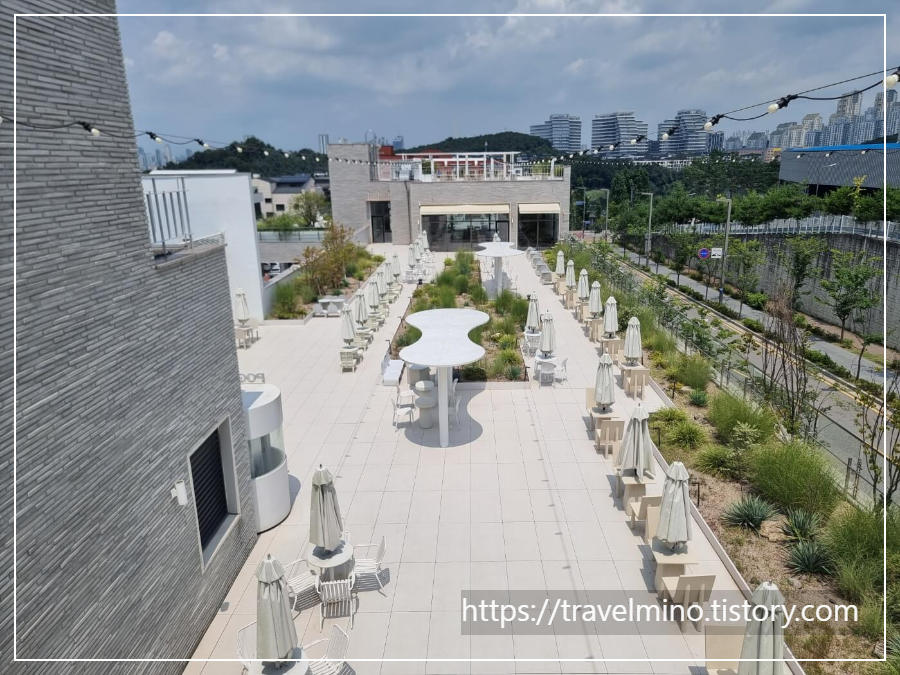 2층 실외로 나가면 파라솔 테이블이 줄지어 행렬을 이룹니다. 폭염이라 손님 맞을 준비는 안되어 있네요. 방문한 당일 얼마나 열기가 후끈거렸는지 숨쉬기가 어려웠어요. 이 많은 테이블이 어느 정도 채워지려면 보름은 지나야 될 듯합니다.